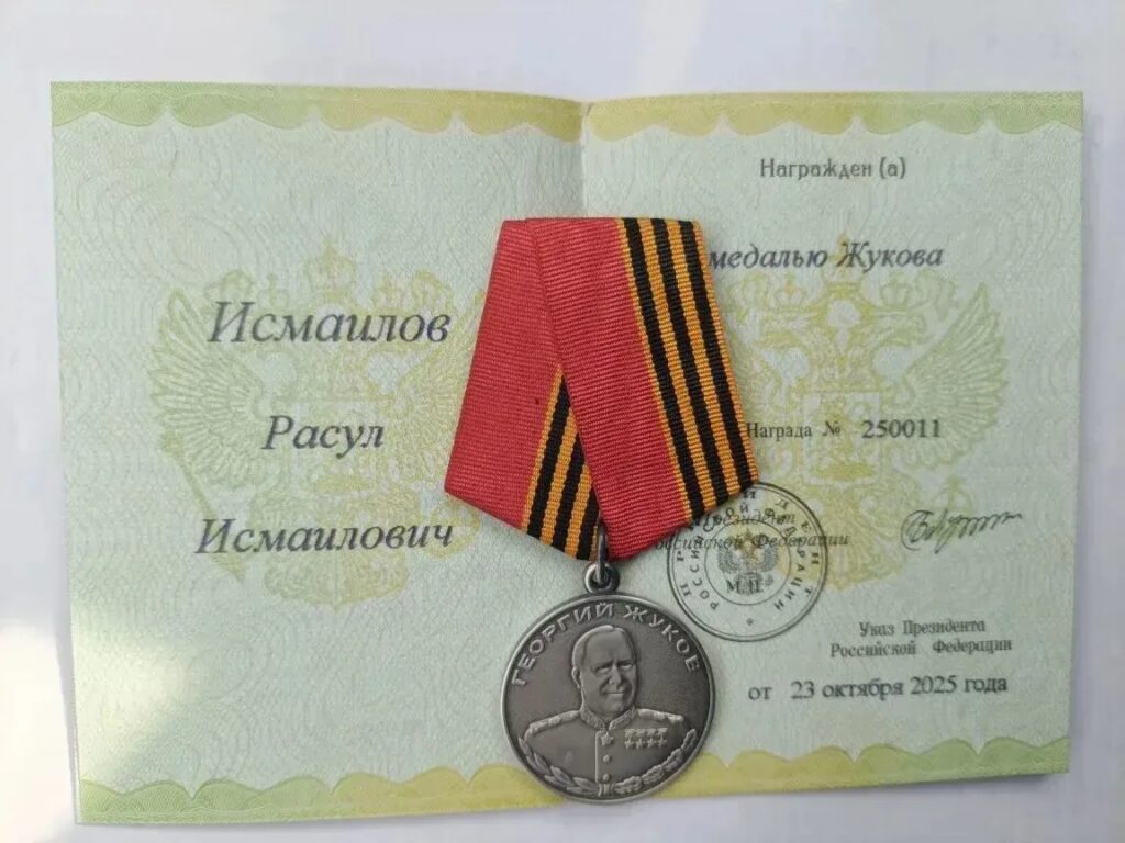 РУТУЛЬСКИЙ РАЙОН, 10 марта — Зори Табасарана. Участник специальной военной операции из Рутульского района Расул Исмаилов отмечен высокой государственной наградой. Указом Президента Российской Федерации Владимира Путина от 23 октября 2025 года он награжден медалью Жукова за мужество, стойкость и верность воинскому долгу.