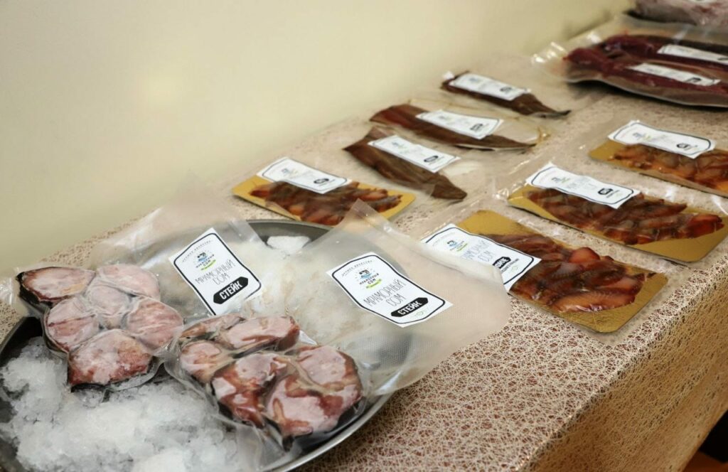 На презентации были представлены различные продукты из мраморного сома, включая снеки, рыбные котлеты, стейки и филе в копченом, замороженном и консервированном виде. Также гости смогли попробовать пельмени, котлеты, шашлык и снеки из мраморного сома.