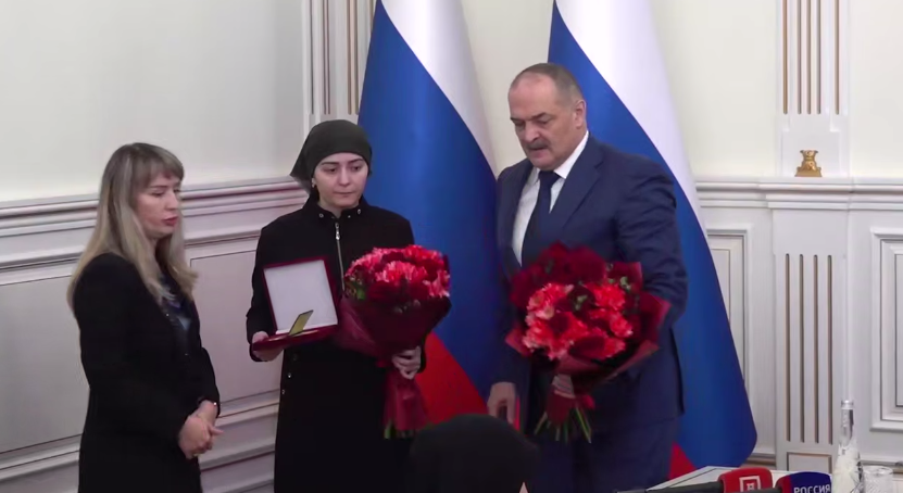 Высшую республиканскую награду из рук руководителя региона получила вдова офицера Дженнет Кучакаева. На церемонии также присутствовали мать и отчим военнослужащего.